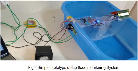 Fig 2. Consist of Node Mcu, Digital output for displaying the humidity, speaker for the siren, ultrasonic sensor. The threshold limit set is 7mm so whenever it reaches the limit the gates will open and siren occurs.