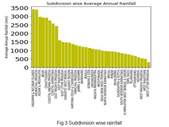 The algorithm used here is bar plot using Matplotlib library to the subdivision wise average rainfall vs. subdivision wise states. The above graph defines the maximum amount of rainfall that occurs always in Andaman Nicobar Islands, Assam, and Meghalaya, Arunachal Pradesh, Bihar, Chhattisgarh. The minimum amount of rainfall occurs in Uttar Pradesh, Rajasthan, Madhya Pradesh, and Uttarakhand.