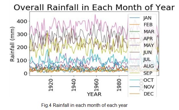 By analyzing the Rainfall data the amount of rainfall in each state with respective months was plotted. In every state of India the maximum amount of rainfall occurred in the month of July. More amount of Rainfall was in Arunachal Pradesh, Karnataka, Madhya Pradesh, and less amount of rainfall in the states of Bihar, Punjab, and Odisha.