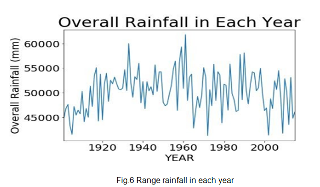 Using pyplot library we can easily analyze that the rate of rainfall was increased in the year of 1961. Rainfall rate was increasing rapidly compared to last few years from these Data Analysis reports. The average amount of rainfall was in the range of 50000 to 55000, the graph represents the overall rainfall analysis each year.